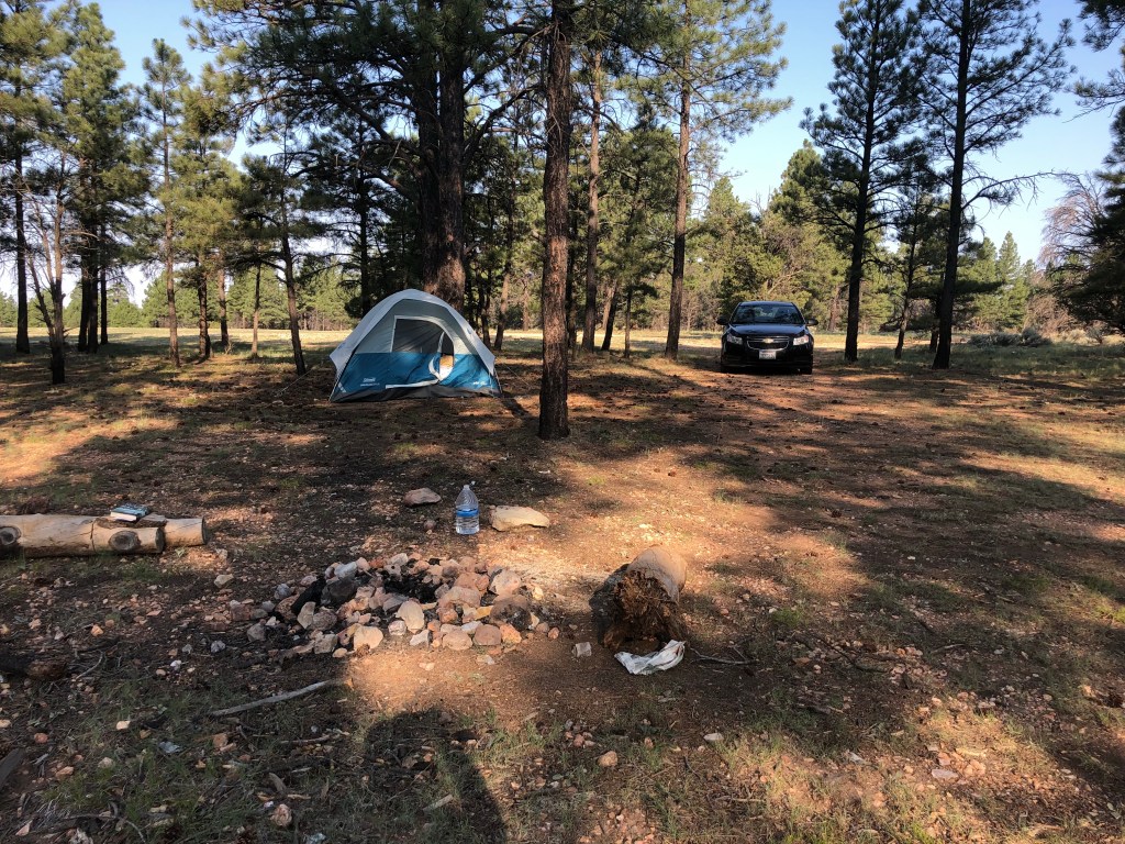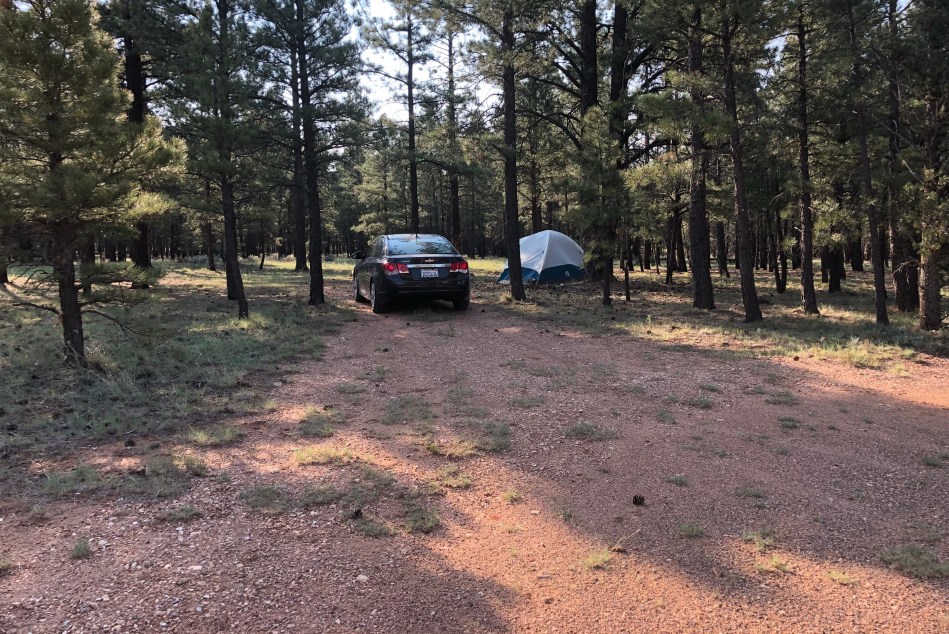 Fire Road 688 is located 10.5 miles south of Mather Point and 3.7 miles south of Tusayan. We watched the mileage once we hit Tusayan so that we wouldn’t miss the road; however, from the north, there is a big sign showing where the turn-off is. The road is also searchable on Google Maps. Once you turn onto the dirt road, it is in impeccable shape – we saw tons of HUGE RVs finding their perfect spots. After traveling about a mile down the road, you will start to see the established camping spots. The spots are absolutely massive, yet they have plenty of space in between each of them, so you never really feel like you have neighbors.