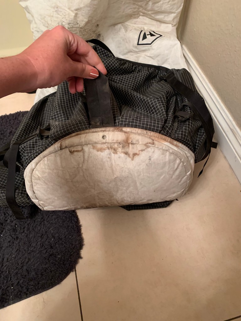 While I absolutely love my backpack (and love the color of it!), it unsurprisingly took about three minutes on the trail to get dirty. I’m pretty sure that it was my very first trip using it where some of my leftover boxed wine leaked out of the outside pocket and left a pretty gnarly stain on the bottom (this is why I can’t have nice things).