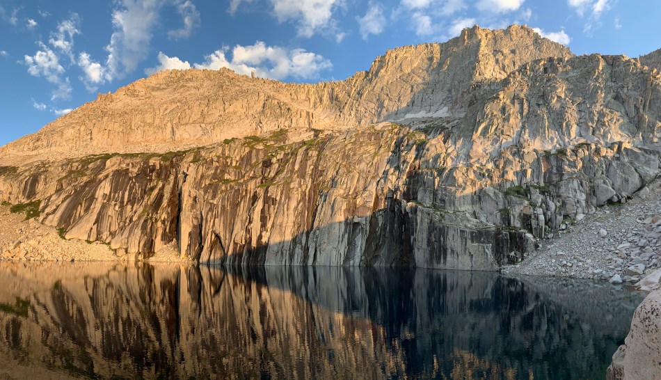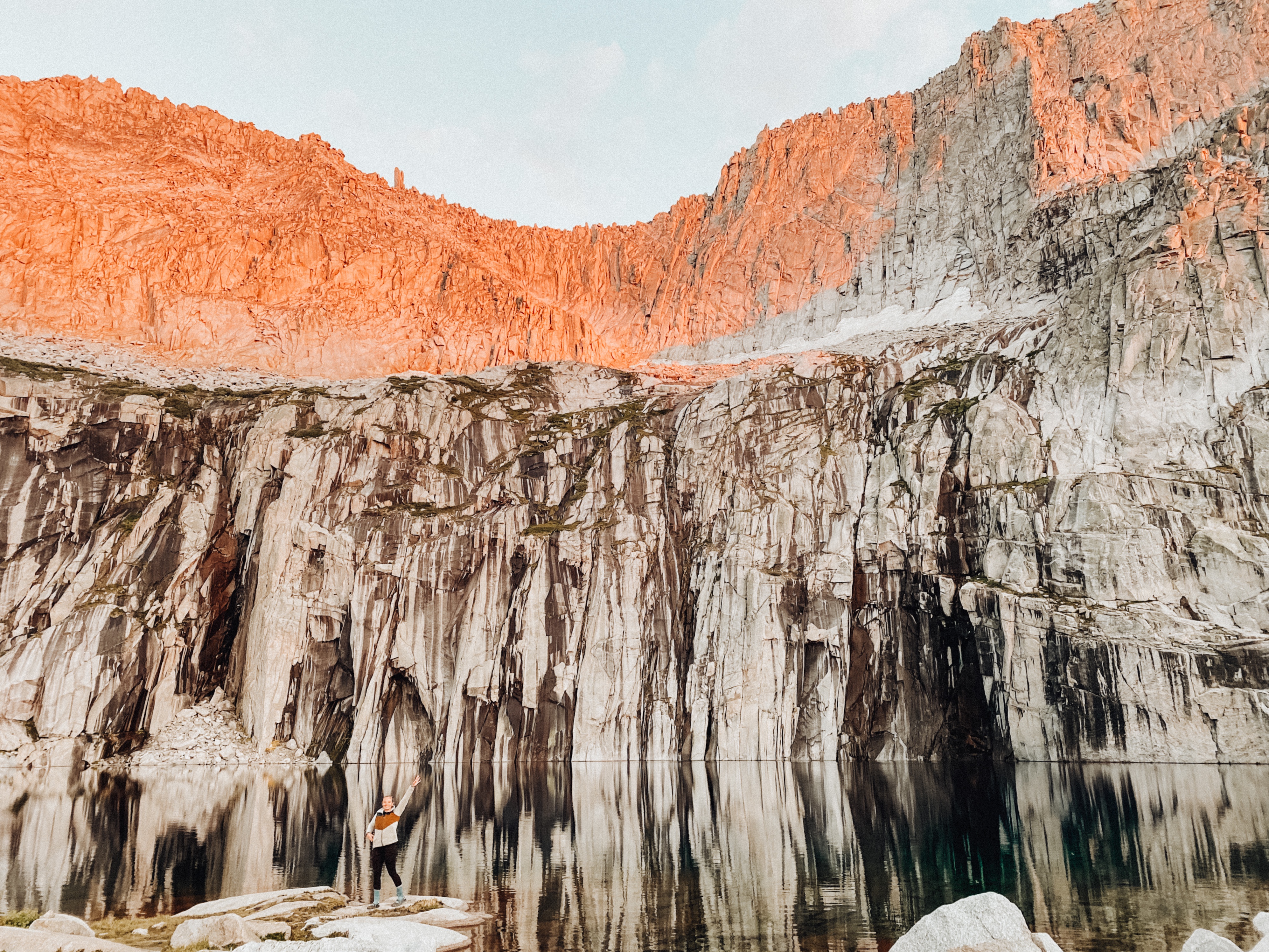 Precipice Lake is known as Ansel Adam’s favorite place in the entire Sierra – and for good reason. It is unlike anything I’ve ever seen before. The walls surrounding the lake are painted with black and white stripes, and there was a small braided waterfall coming down into the inky black water below. It was so much bigger than I expected it to be too – it honestly was like an amphitheater. Truly magical. No wonder it is Ansel Adam’s favorite place in the Sierra! I wonder if his soul remains there – I sure wouldn’t mind if mine did!