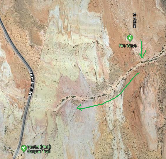 With a little help of Google Maps and the Paint application, you can really see how easy it is to get to Pastel Canyon from the Fire Wave. When I was reading instructions about following a particular wash, I had it in my head that I was going to have to pick out the right wash out of 10 different washes going in opposite directions – Nope. There is one wash. Follow the one wash. You will find Pastel Canyon.