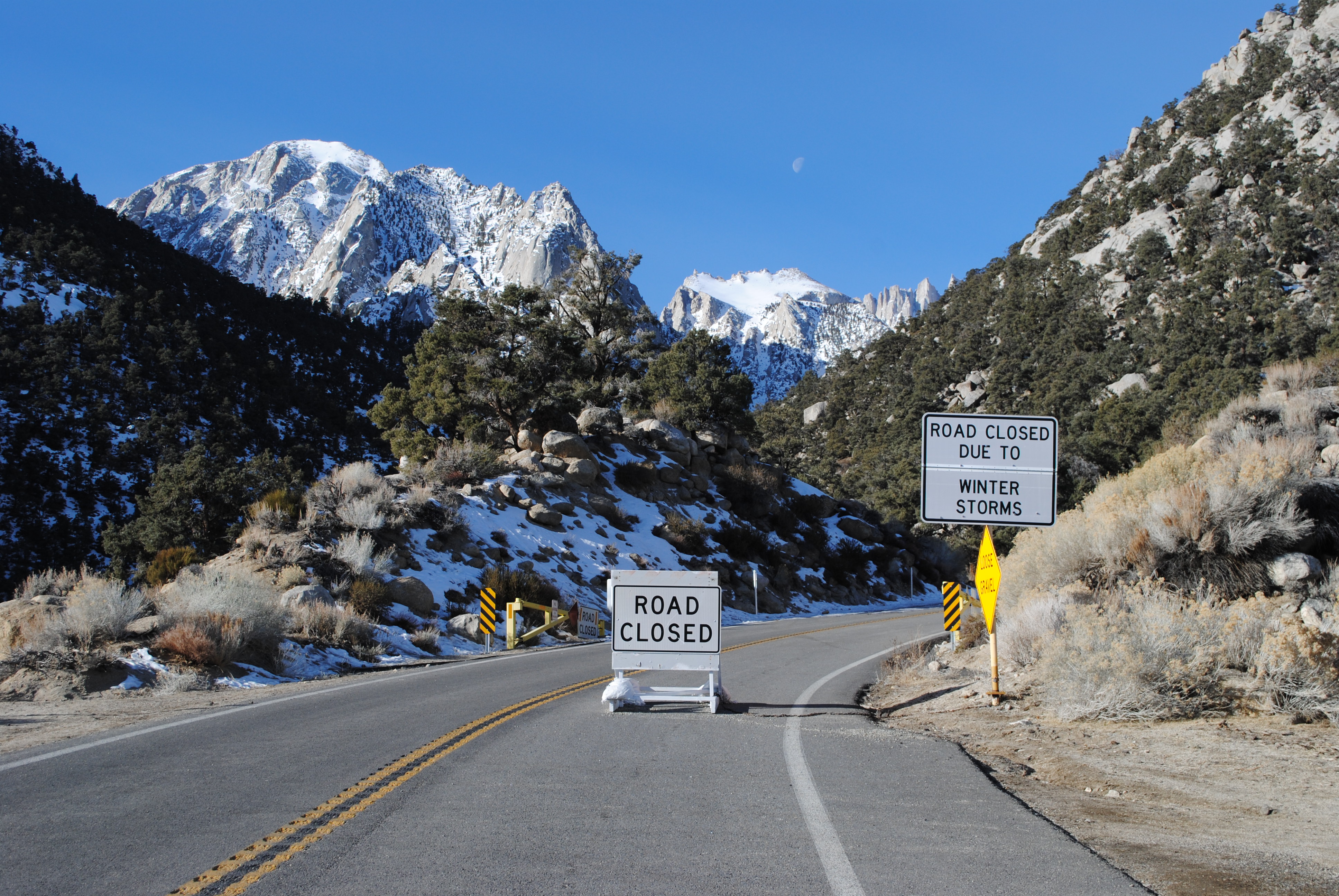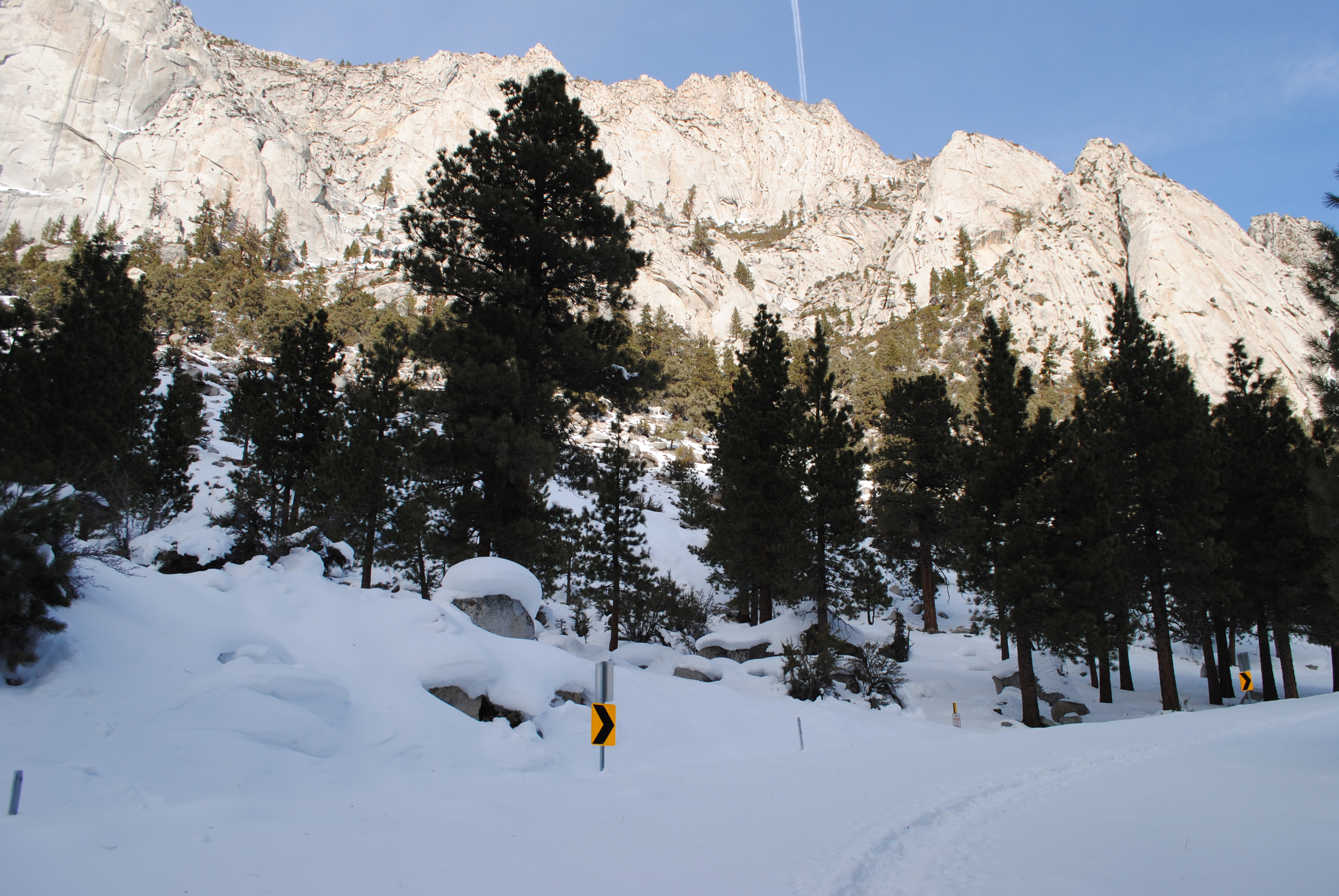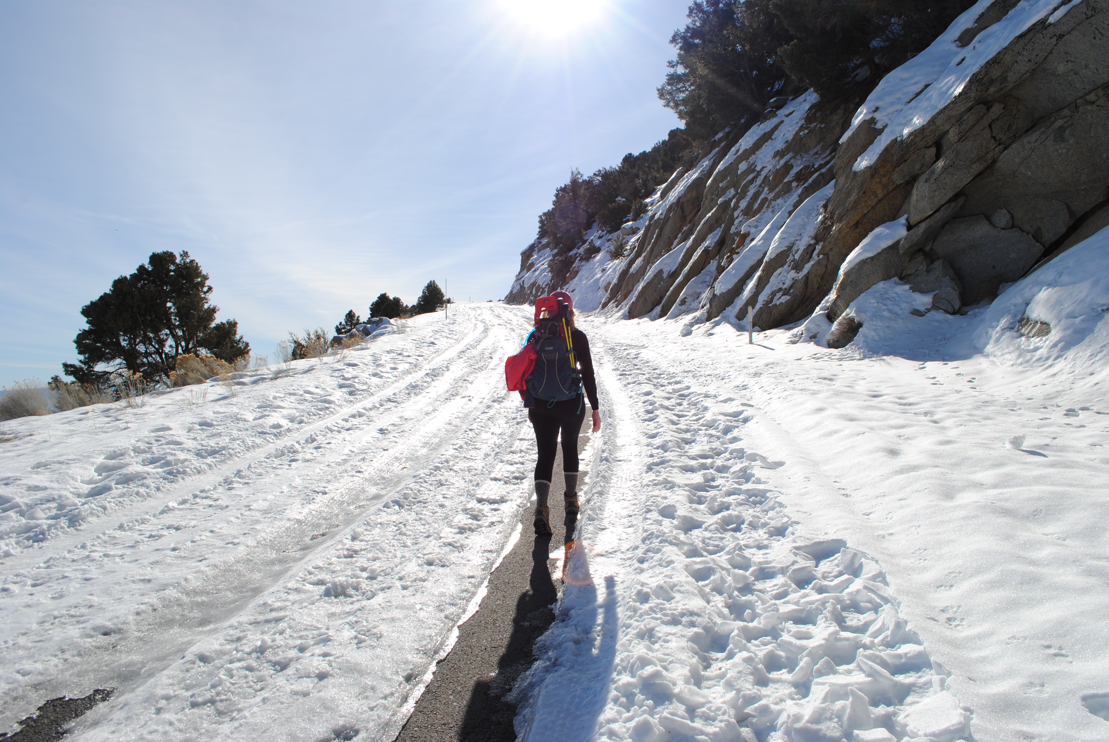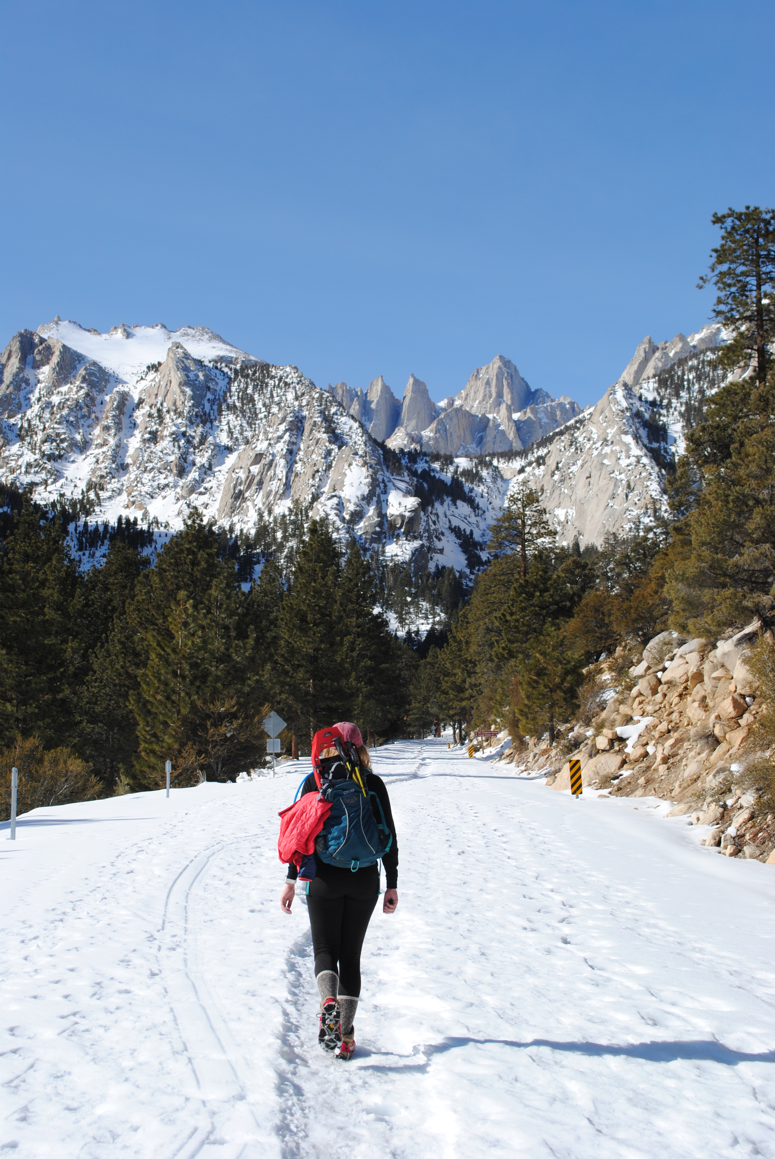 A note about the road closure: Unless there was recently a significant storm, you probably will not encounter snow as low as the closure. The closure is located at an elevation of 6312 feet, which is pretty low for Sierra snow line. That being said, even though you may be tempted to drive up the road until you actually hit snow, I would recommend against it. Rumor has it that you can get ticketed if caught past the closure. Although it’s probably pretty rare that CHP would be up there ticketing people, we didn’t want to take that risk. Moreso than the danger of getting ticketed, in my opinion, would be the danger of all of the ice up there! Although the road was clear and dry when we started walking, it quickly began to get icy and did not thaw out that day. Whitney Portal Road is pretty skinny; I wouldn’t want to get caught on ice without a place to turn around – or to get caught slipping and sliding so close to the edge! That being said, we saw a few trucks pass us past the closure and were fine. To each their own, I suppose.