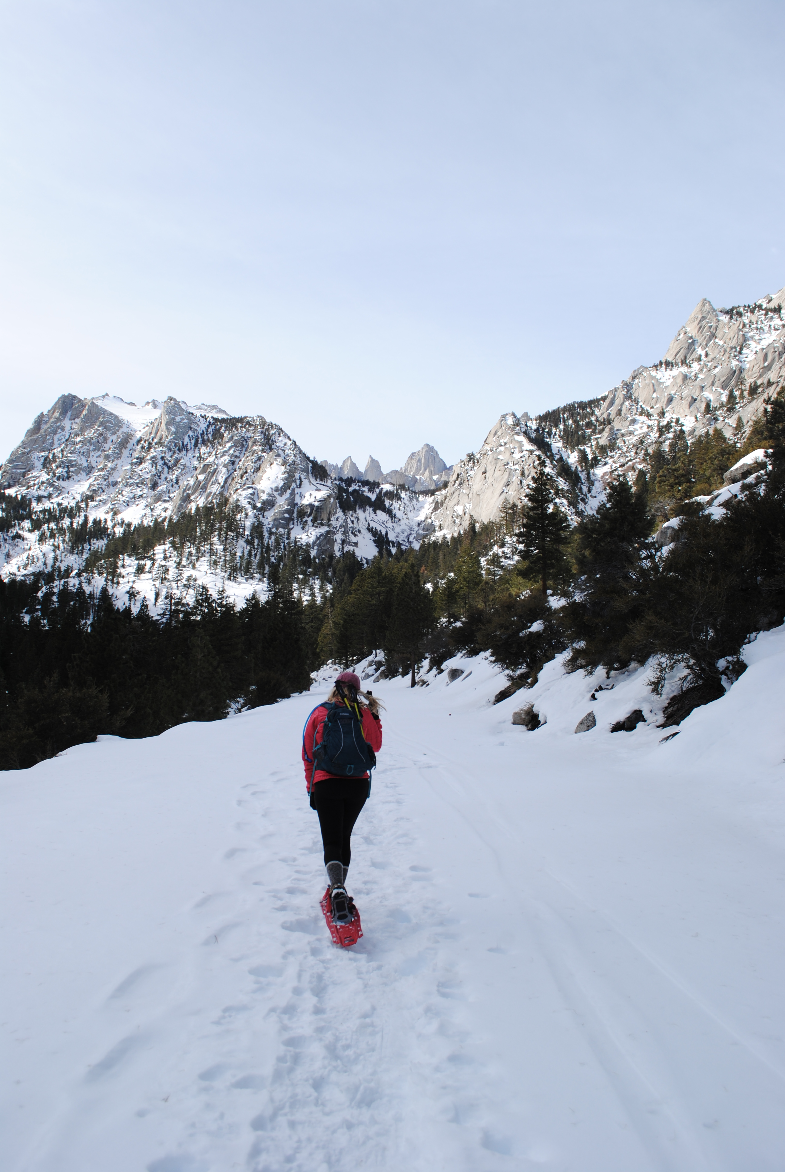 Eventually, we entered the shadow of Lone Pine Peak and the temp DROPPED. It was here that we started postholing quite a bit, so we ended up putting on our snowshoes. You could have gotten by without them, but we found them to be more of a help than a hindrance (as premature snowshoeing tends to be)!