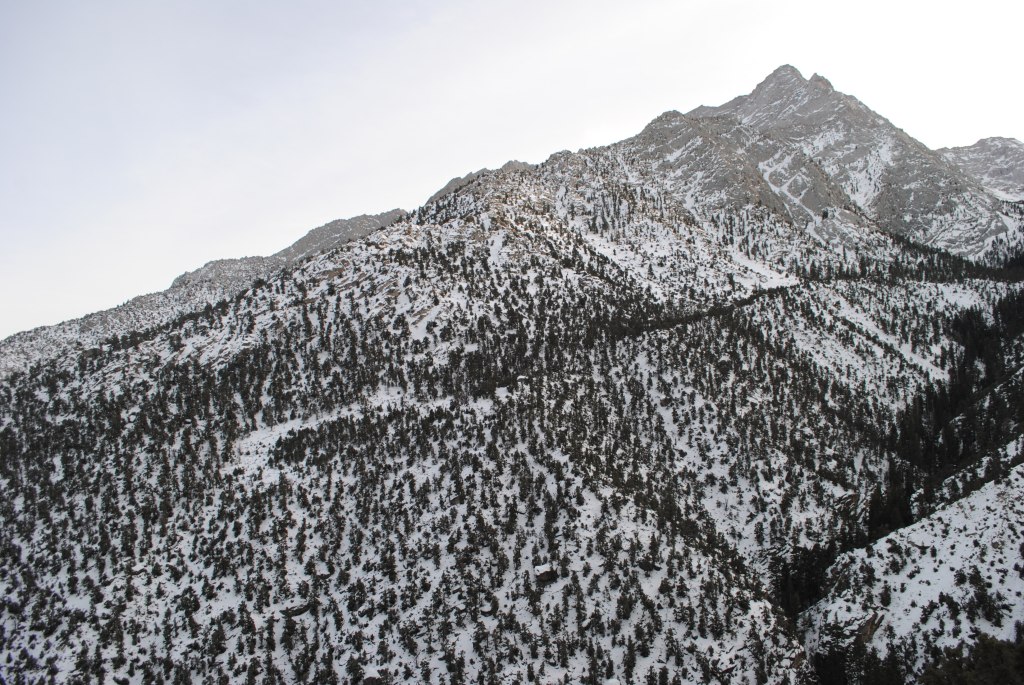 After a few quick s-turns, you take one more corner, and BAM! You are treated to the first up-close and personal view of Mt. Whitney herself. It was here in which the snow became (almost instantaneously) pretty deep. We put on our microspikes once again and did not take them off! Once you see Mt. Whitney for the first time, the road continues along Lone Pine Creek towards the summit.